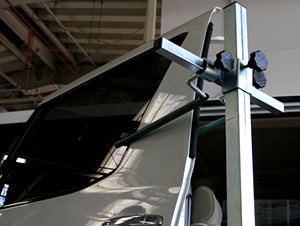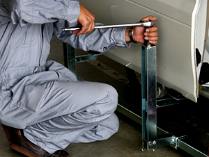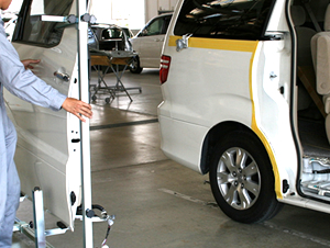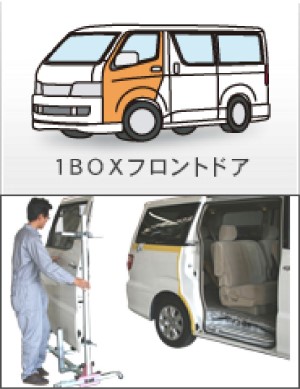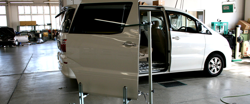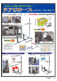 今まで大きな負担となっていたワンボックスカーのフロントドアやスライドドアの脱着作業をサポートし、作業者の安全性と作業効率を飛躍的にアップさせるドア脱着用作業スタンド。