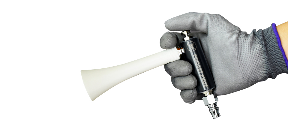 本体の先端にあるコーン(ラッパ型の部分)に内蔵されたノズルが高回転運動をすることによって振動エアーが作り出され、直線のエアーを超える強力なエアーを噴射します。