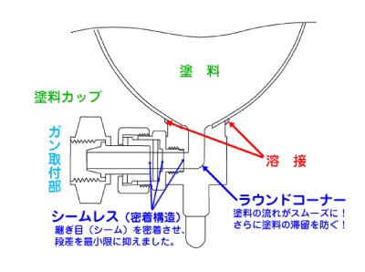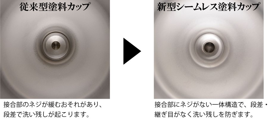 特殊溶接で継ぎ目を密着させたシームレス構造と、サラ形ネジを使わない一体成型カップジョイント頭で段差を解消したので、カップ内の塗料残留を極力抑え、洗浄シンナーの使用量が大幅に減らせます。